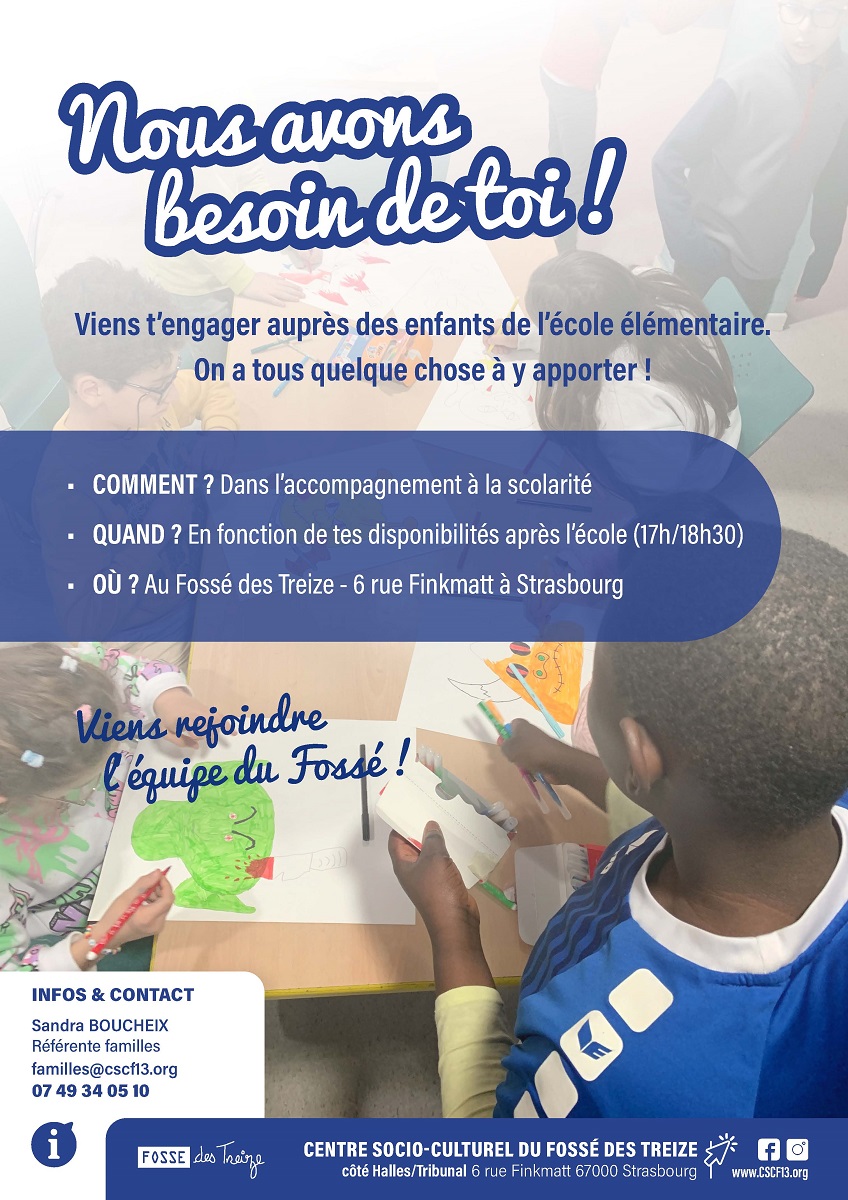 L’association du Fossé des Treize, à Strasbourg, recherche des étudiants pour être bénévole pour accompagner des enfants de primaire dans le cadre de l’aide aux devoirs.